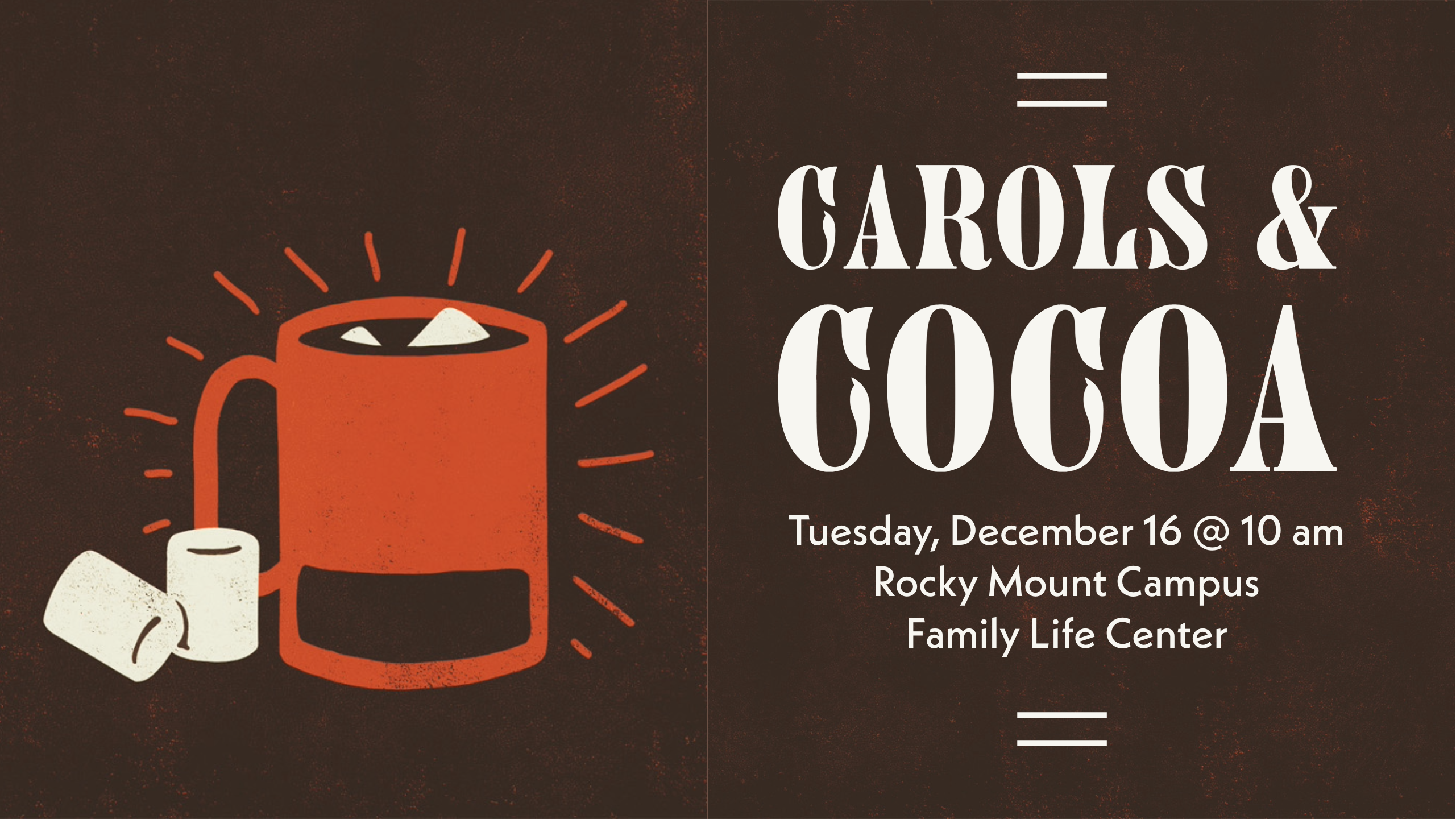 Join us at the Rocky Mount Campus on Wednesday, December 3rd at 7:30PM for our Christmas Tree Lighting. There will be cookies, hot chocolate and singing!