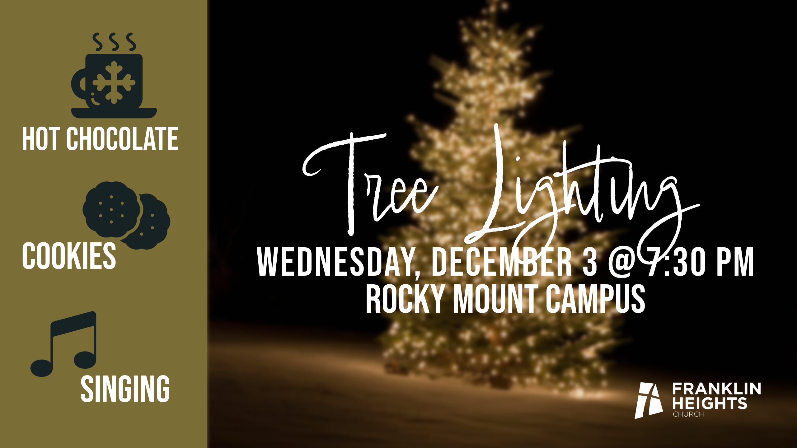 Join us at the Rocky Mount Campus on Wednesday, December 3rd at 7:30PM for our Christmas Tree Lighting. There will be cookies, hot chocolate and singing!