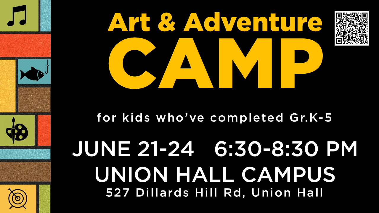 Stories of God’s great adventure will be shared through: Art Projects, Disc Golf, Fishing, Music, BB Guns and more! Camp will be held June 22-25 at the Union Hall Campus for students who have completed Kindergarten through 5th grade. Online pre-registration is closed but families may register in person on the first night of Camp.